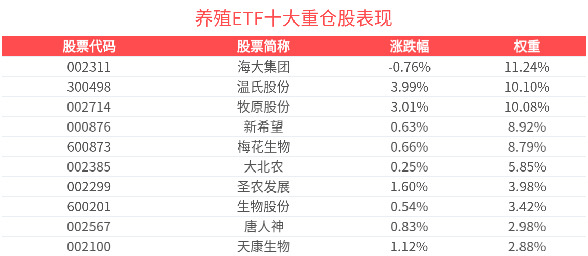数据显示,截至2025年5月30日,中证畜牧养殖指数(930707)前十大权重股分别为海大集团(002311)、牧原股份(002714)、温氏股份(300498)、新希望(000876)、梅花生物(600873)、大北农(002385)、圣农发展(002299)、生物股份(600201)、天康生物(002100)、唐人神(002567)策略红,前十大权重股合计占比68.9%。