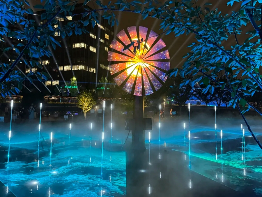在“水之诗”的园路,彩虹投影搭配先进人体追踪设备,行人经过时,地面便投射出以荷花莲叶为元素的阵阵涟漪,仿佛踏入了一幅灵动的水墨画。